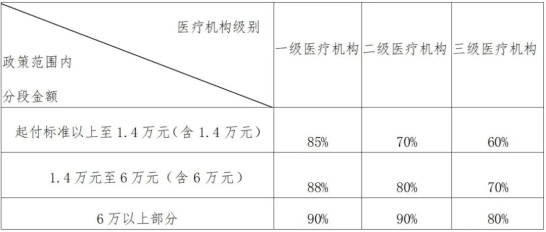 在中医(蒙医)医疗机构住院发生的医疗费用,中医药(蒙医药)部分在原报销比例的基础上提高15%,最高不超过95%。2.大病保险大病保险起付标准为一个年度内个人累计负担政策范围内医疗费1.4万元,起付标准以上部分报销比例60%,不设封顶线。特困人员、低保对象、返贫致贫人口大病保险实施倾斜支付政策,起付标准降低50%,支付比例提高5个百分点。