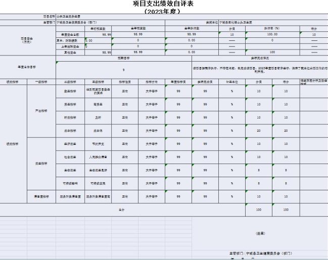 宁城县五化镇山头卫生院根据预算绩效管理要求组织对2023年一般公共预算项目支出全面开展绩效自评,其中一级项目1个,二级项目0个,共涉及资金95.99万元,占一般公共预算项目支出总额的100%;政府性基金预算项目0个,其中,一级项目 0 个,二级项目0个,共涉及资金0万元,占应纳入绩效自评的政府性基金预算项目支出总额的100%。