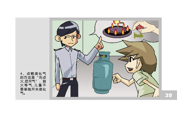 4、点燃液化气的方法是“先点火,后开气”,到火等气,儿童不要单独开关液化气。