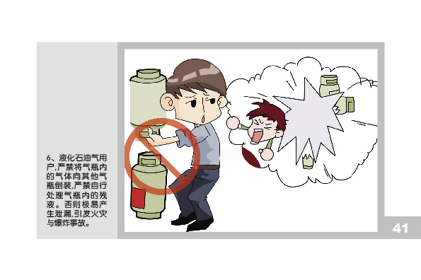 5、液化石油气用户,严禁将气瓶内的气体向其他气瓶倒装,严禁自行处理气瓶内的残液。否则极易产生泄漏,引发火灾与爆炸事故。