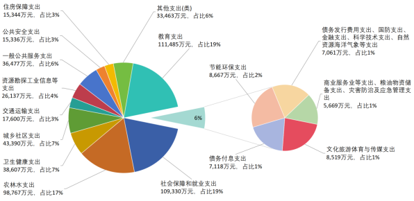 全县一般公共预算支出合计765,034万元,其中:本级支出582,970万元,上解上级支出46,578万元,一般债务还本支出123,821万元,调出资金5,680万元,土地指标调剂转移性支出5,985万元。