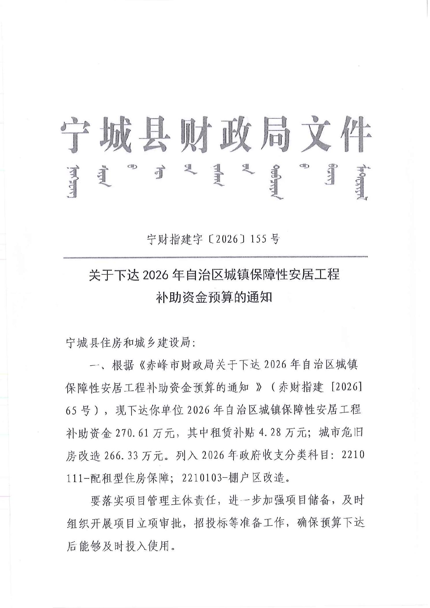 关于下达2026年自治区城镇保障性安居工程补助资金预算的通知